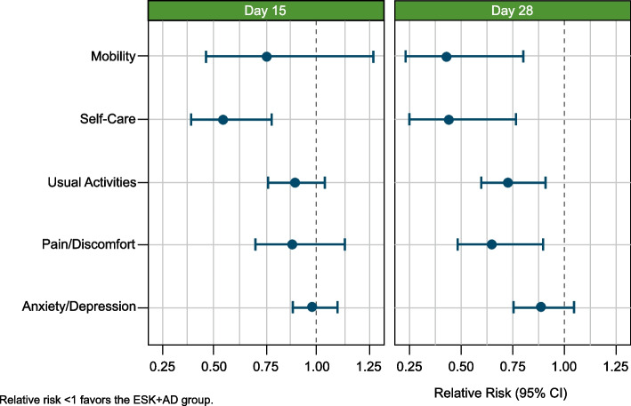 Results: The full analysis set included 223 patients (ESK + AD: 114; AD + PBO: 109; mean [SD] age: 45.7 [11.89]). At Day 28, a lower percentage of patients reported impairment in the ESK + AD vs. AD + PBO group in all five EQ-5D-5L dimensions: mobility (10.6% vs. 25.0%), self-care (13.5% vs. 32.0%), usual activities (51.9% vs. 72.0%), pain/discomfort (35.6% vs. 54.0%), and anxiety/depression (69.2% vs. 78.0%). The mean (SD) change from baseline in HSI at Day 28 was 0.310 (0.219) for ESK + AD and 0.235 (0.252) for AD + PBO, with a higher score reflecting better levels of health. The mean (SD) change from baseline in EQ-VAS score at Day 28 was greater in ESK + AD (31.1 [25.67]) vs. AD + PBO (22.1 [26.43]). The mean (SD) change in the SDS total score from baseline to Day 28 also favored ESK + AD (-13.6 [8.31]) vs. AD + PBO (-9.4 [8.43]).