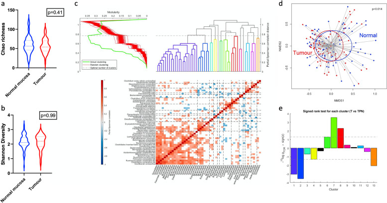 Methods: A multicentre, prospective observational study was conducted of CRC patients undergoing primary surgical resection in the UK (n = 74) and Czech Republic (n = 61). Analysis was performed using metataxonomics, ultra-performance liquid chromatography-mass spectrometry (UPLC-MS), targeted bacterial qPCR and tumour exome sequencing. Hierarchical clustering accounting for clinical and oncological covariates was performed to identify clusters of bacteria and metabolites linked to CRC. Cox proportional hazards regression was used to ascertain clusters associated with disease-free survival over median follow-up of 50 months.