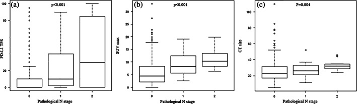 Results: Of 291 patients, 40 had postoperative nodal upstaging (n = 25, N1; n = 15, N2). Large tumor size and high maximum standardized uptake value were significantly associated with nodal upstaging. The nodal upstaging group had a higher proportion of patients with solid adenocarcinoma and lymphatic, vascular, and pleural invasion than the pathological N0 group. Further, the nodal upstaging group had a higher proportion of patients with positive programmed death ligand-1 expression than the pathological N0 group. Univariate and multivariate analyses showed that tumor size and positive programmed death ligand-1 expression were associated with nodal upstaging.