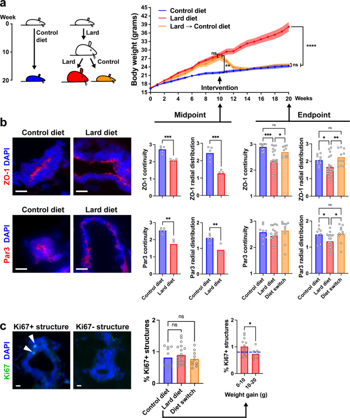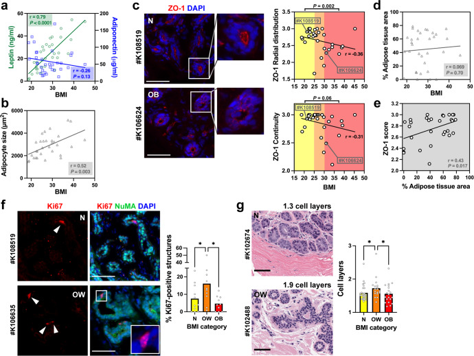 Molecular links between breast cancer risk factors and pro-oncogenic tissue alterations are poorly understood. The goal of this study was to characterize the impact of overweight and obesity on tissue markers of risk, using normal breast biopsies, a mouse model of diet-induced obesity, and cultured breast acini. Proliferation and alteration of epithelial polarity, both necessary for tumor initiation, were quantified by immunostaining. High BMI (>30) and elevated leptin were associated with compromised epithelial polarity whereas overweight was associated with a modest increase in proliferation in human and mice mammary glands. Human serum with unfavorable adipokine levels altered epithelial polarization of cultured acini, recapitulating the effect of leptin. Weight loss in mice led to metabolic improvements and restored epithelial polarity. In acini cultures, alteration of epithelial polarity was prevented by antioxidants and could be reverted by normalizing culture conditions. This study shows that obesity and/or dietary factors modulate tissue markers of risk. It provides a framework to set target values for metabolic improvements and to assess the efficacy of interventional studies aimed at reducing breast cancer risk.