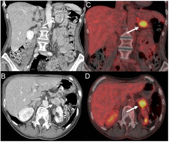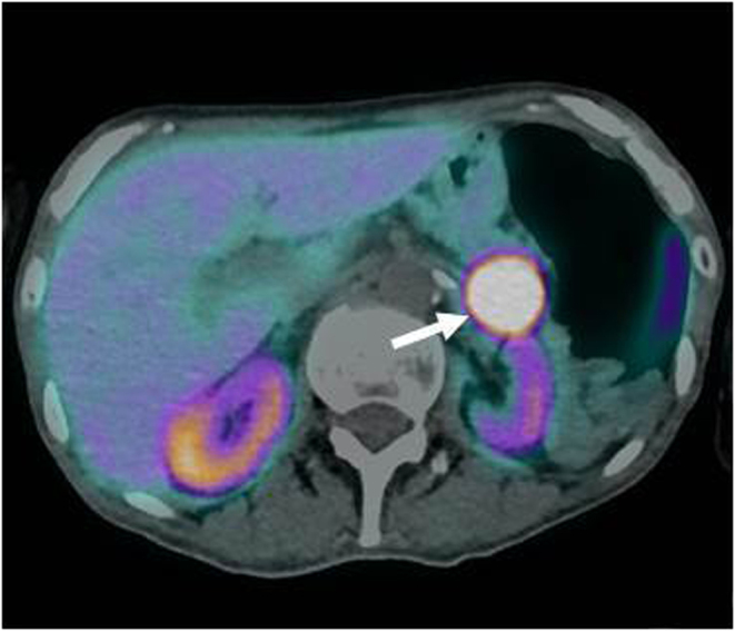 Summary: Cushing's syndrome due to ectopic adrenocorticotropic hormone (ACTH) secretion (EAS) by a pheochromocytoma is a challenging condition. A woman with hypertension and an anamnestic report of a 'non-secreting' left adrenal mass developed uncontrolled blood pressure (BP), hyperglycaemia and severe hypokalaemia. ACTH-dependent severe hypercortisolism was ascertained in the absence of Cushingoid features, and a psycho-organic syndrome developed. Brain imaging revealed a splenial lesion of the corpus callosum and a pituitary microadenoma. The adrenal mass displayed high uptake on both 18F-FDG PET/CT and 68Ga-DOTATOC PET/CT; urinary metanephrine levels were greatly increased. The combination of antihypertensive drugs, high-dose potassium infusion, insulin and steroidogenesis inhibitor normalized BP, metabolic parameters and cortisol levels; laparoscopic left adrenalectomy under intravenous hydrocortisone infusion was performed. On combined histology and immunohistochemistry, an ACTH-secreting pheochromocytoma was diagnosed. The patient's clinical condition improved and remission of both hypercortisolism and catecholamine hypersecretion ensued. Brain magnetic resonance imaging showed a reduction of the splenial lesion. Off-therapy BP and metabolic parameters remained normal. The patient was discharged on cortisone replacement therapy for post-surgical hypocortisolism. EAS due to pheochromocytoma displays multifaceted clinical features and requires prompt diagnosis and multidisciplinary management in order to overcome the related severe clinical derangements.