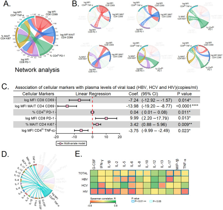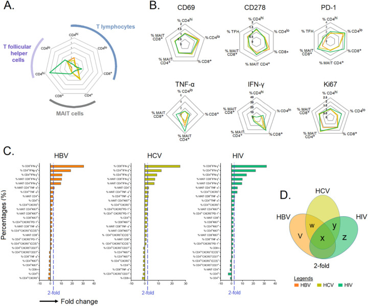 Chronic viral infection results in impaired immune responses rendering viral persistence. Here, we investigated the role of immune activation and compared the quality of T-cell responses in chronic HBV, HCV, and HIV infections. Cytokines were measured using a commercial Bio-plex Pro Human Cytokine Grp I Panel 17-plex kit (BioRad, Hercules, CA, USA). Inflammation was assessed by measuring an array of plasma cytokines, and peripheral CD4+ T cells including circulating Tfh cells, CD8+ T cells, and TCR iVα7.2+ MAIT cells in chronic HBV, HCV, and HIV-infected patients and healthy controls. The cells were characterized based markers pertaining to immune activation (CD69, ICOS, and CD27) proliferation (Ki67), cytokine production (TNF-α, IFN-γ) and exhaustion (PD-1). The cytokine levels and T cell phenotypes together with cell markers were correlated with surrogate markers of disease progression. The activation marker CD69 was significantly increased in CD4+ hi T cells, while CD8+ MAIT cells expressing IFN-γ were significantly increased in chronic HBV, HCV and HIV infections. Six cell phenotypes, viz., TNF-α+CD4+ lo T cells, CD69+CD8+ T cells, CD69+CD4+ MAIT cells, PD-1+CD4+ hi T cells, PD-1+CD8+ T cells, Ki67+CD4+ MAIT cells were independently associated with decelerating the plasma viral load (PVL). TNF-α levels showed a positive correlation with increase in cytokine levels and decrease in PVL. Chronic viral infection negatively impacts the quality of peripheral MAIT cells and TFH cells via expression of both activating and inhibitory receptors.
