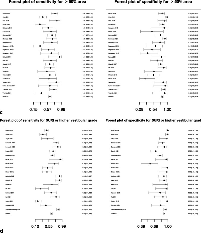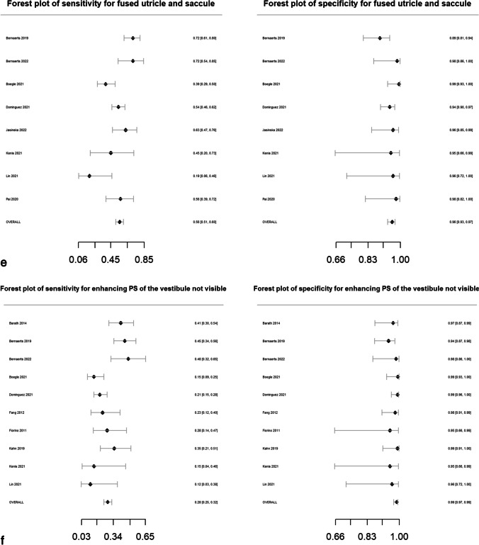 Materials and methods: Case-controlled studies documenting the diagnostic performance of MRI descriptors in distinguishing MD ears from asymptomatic ears or ears with other audio-vestibular conditions were identified (MEDLINE, EMBASE, Web of Science, Scopus databases: updated 17/2/2022). Methodological quality was evaluated with Quality Assessment of Diagnostic Accuracy Studies version 2. Results were pooled using a bivariate random-effects model for evaluation of sensitivity, specificity and diagnostic odds ratio (DOR). Meta-regression evaluated sources of heterogeneity, and subgroup analysis for individual clinical classifications was performed.