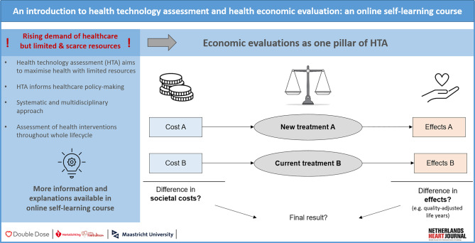Cardiovascular diseases impose an enormous burden on patients and society. New health technologies promise to lower this burden; however, novel treatments often come at a high cost. In the Netherlands, health technology assessment (HTA) is increasingly being used to inform policy bodies about the optimal distribution of scarce healthcare resources and to guide decision-making about financing and reimbursement. In particular, economic evaluations, as one pillar of HTA, are frequently used to compare the costs and effects of different interventions. This paper aims to define HTA and its relevance to healthcare policy as well as providing a comprehensive overview of the methodology of economic evaluations targeting health professionals and researchers with limited prior knowledge of this subject. Accordingly, different types of economic evaluations are introduced, together with their respective costs and outcomes. Further, the results of economic evaluations are explained, along with techniques for performing them and methods for coping with uncertainty. In addition to this paper-based learning format, each chapter is complemented by a video lecture with further information and practical examples, helping to better understand and analyse health economic studies.