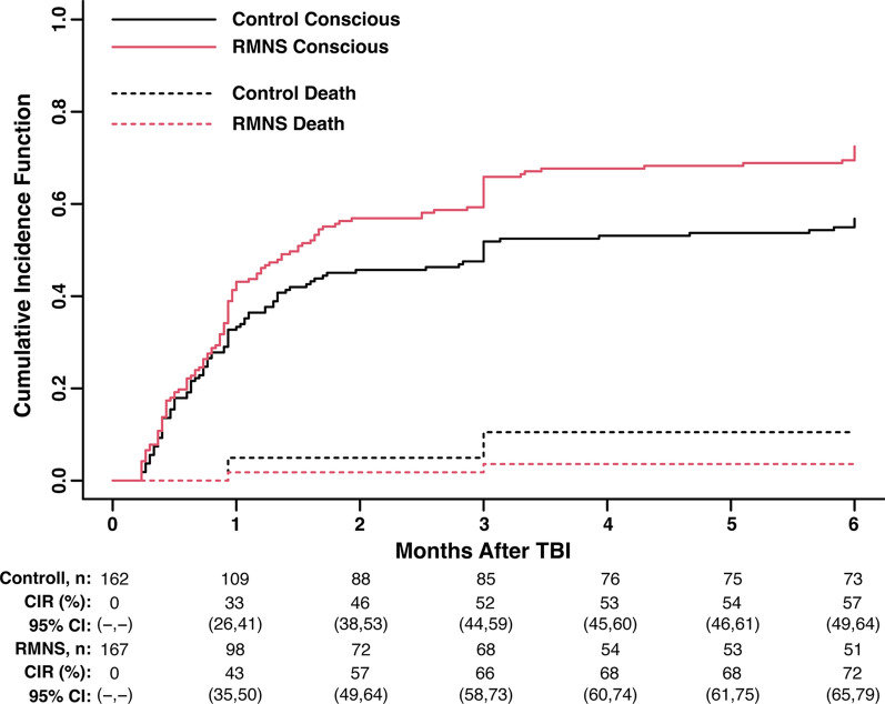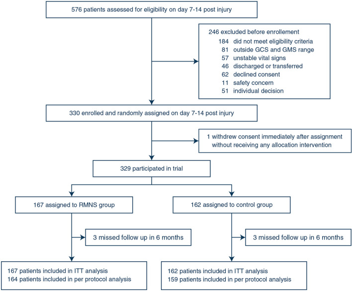 Results: Between March 26, 2016, and October 18, 2020, 329 participants were recruited, of whom 167 were randomised to the RMNS group and 162 to the control group. At 6 months post-injury, a higher proportion of patients in the RMNS group regained consciousness compared with the control group (72.5%, n = 121, 95% confidence interval (CI) 65.2-78.7% vs. 56.8%, n = 92, 95% CI 49.1-64.2%, p = 0.004). GOSE at 3 months and 6 months (5 [interquartile range (IQR) 3-7] vs. 4 [IQR 2-6], p = 0.002; 6 [IQR 3-7] vs. 4 [IQR 2-7], p = 0.0005) and FOUR at 28 days (15 [IQR 13-16] vs. 13 [interquartile range (IQR) 11-16], p = 0.002) were significantly increased in the RMNS group compared with the control group. Trajectory analysis showed that significantly more patients in the RMNS group had faster GCS, CRS-R and DRS improvement (p = 0.01, 0.004 and 0.04, respectively). Adverse events were similar in both groups. No serious adverse events were associated with the stimulation device.