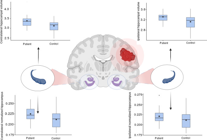 Results: We observed a statistically significant increase in the absolute mean hippocampal volume (p = 0.017), as well as in the ipsilateral (compared to the lesion, p = 0.027) and the contralateral hippocampal volumes (p = 0.014) in the group of patients. When the data were normalized per total intracranial volume, we confirmed a statistically significant increase only in the contralateral hippocampal volume (p = 0.042).