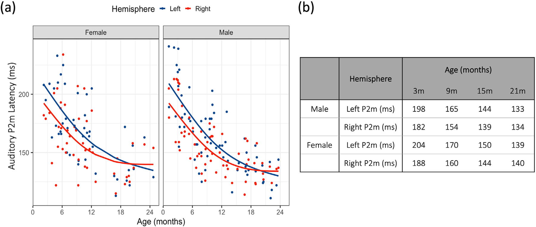 The infant auditory system rapidly matures across the first years of life, with a primary goal of obtaining ever-more-accurate real-time representations of the external world. Our understanding of how left and right auditory cortex neural processes develop during infancy, however, is meager, with few studies having the statistical power to detect potential hemisphere and sex differences in primary/secondary auditory cortex maturation. Using infant magnetoencephalography (MEG) and a cross-sectional study design, left and right auditory cortex P2m responses to pure tones were examined in 114 typically developing infants and toddlers (66 males, 2 to 24 months). Non-linear maturation of P2m latency was observed, with P2m latencies decreasing rapidly as a function of age during the first year of life, followed by slower changes between 12 and 24 months. Whereas in younger infants auditory tones were encoded more slowly in the left than right hemisphere, similar left and right P2m latencies were observed by ∼21 months of age due to faster maturation rate in the left than right hemisphere. No sex differences in the maturation of the P2m responses were observed. Finally, an earlier left than right hemisphere P2m latency predicted better language performance in older infants (12 to 24 months). Findings indicate the need to consider hemisphere when examining the maturation of auditory cortex neural activity in infants and toddlers and show that the pattern of left-right hemisphere P2m maturation is associated with language performance.