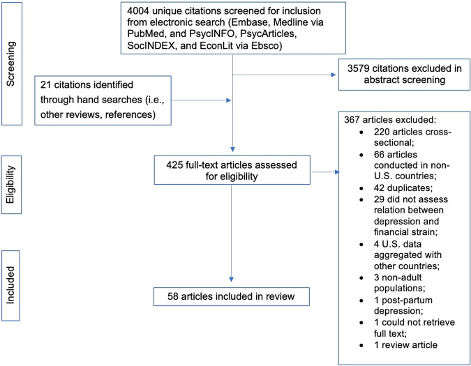 While the association between assets and depression has been established, less is known about the link between financial strain and depression. Given rising financial strain and economic inequity due to the COVID-19 pandemic, understanding the role that financial strain plays in shaping population depression in the United States is particularly salient. We conducted a scoping review of the peer-reviewed literature on financial strain and depression published from inception through January 19, 2023, in Embase, Medline via PubMed, and PsycINFO, PsycArticles, SocINDEX, and EconLit via Ebsco. We searched, reviewed, and synthesized the literature on longitudinal studies on financial strain and depression conducted in the United States. Four thousand and four unique citations were screened for eligibility. Fifty-eight longitudinal, quantitative articles on adults in the United States were included in the review. Eighty-three percent of articles (n = 48) reported a significant, positive association between financial strain and depression. Eight articles reported mixed results, featuring non-significant associations for some sub-groups and significant associations for others, one article was unclear, and one article reported no significant association between financial strain and depression. Five articles featured interventions to reduce depressive symptoms. Effective interventions included coping mechanisms to improve one's financial situation (e.g., mechanisms to assist in finding employment), to modify cognitive behavior (e.g., reframing mindset), and to engage support (e.g., engaging social and community support). Successful interventions were tailored to participants, were group-based (e.g., they included family members or other job seekers), and occurred over multiple sessions. While depression was defined consistently, financial strain was defined variably. Gaps in the literature included studies featuring Asian populations in the United States and interventions to reduce financial strain. There is a consistent, positive association between financial strain and depression in the United States. More research is needed to identify and test interventions that mitigate the ill effects of financial strain on population's mental health.
