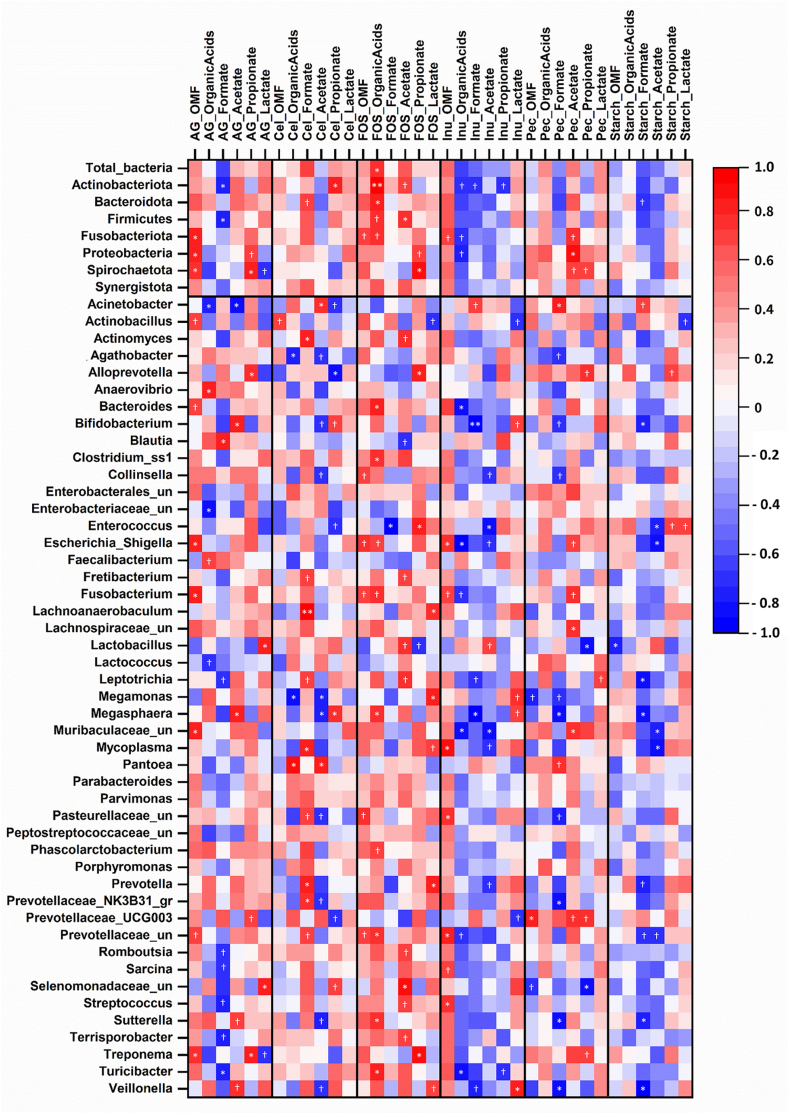 Results: Forty-five percent of the identified genera in the digesta differed across diets. For instance, the number of Lactococcus was 115-fold greater (P ≤ 0.05) in the digesta of pigs fed the pigeon pea diet than for pigs fed the wheat bran diet. For both in vitro organic matter fermentability and organic acid production, there were significant (P ≤ 0.05) interactions between the inoculum and the fiber source. For instance, pectin and resistant starch resulted in 1.6- to 31-fold more (P ≤ 0.05) lactic acid production when fermented by the pigeon pea inoculum than other inocula. For specific fiber sources, statistically significant correlations were found between the number of bacteria from certain members of the ileal microbial community and fermentation outcomes.