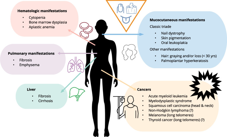 The end of each chromosome consists of a DNA region termed the telomeres. The telomeres serve as a protective shield against degradation of the coding DNA sequence, as the DNA strand inevitably ‒ with each cell division ‒ is shortened. Inherited genetic variants cause telomere biology disorders when located in genes (e.g. DKC1, RTEL1, TERC, TERT) playing a role in the function and maintenance of the telomeres. Subsequently patients with telomere biology disorders associated with both too short or too long telomeres have been recognized. Patients with telomere biology disorders associated with short telomeres are at increased risk of dyskeratosis congenita (nail dystrophy, oral leukoplakia, and hyper- or hypo-pigmentation of the skin), pulmonary fibrosis, hematologic disease (ranging from cytopenia to leukemia) and in rare cases very severe multiorgan manifestations and early death. Patients with telomere biology disorders associated with too long telomeres have in recent years been found to confer an increased risk of melanoma and chronic lymphocytic leukemia. Despite this, many patients have an apparently isolated manifestation rendering telomere biology disorders most likely underdiagnosed. The complexity of telomere biology disorders and many causative genes makes it difficult to design a surveillance program which will ensure identification of early onset disease manifestation without overtreatment.