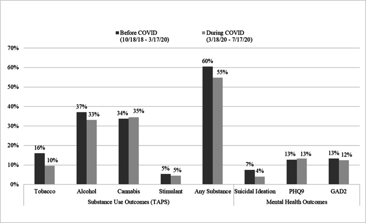 Results: Of 8,954 eligible visits, 3,904 completed screenings (420 during COVID, 3,484 pre-COVID), with lower overall completion rates during COVID (38% vs. 44%). Patients completing screening during COVID were more likely to be White (63% vs. 55%), male (94% vs. 90%), and MSM (80% vs., 75%). Adjusted PRs comparing COVID and pre-COVID (reference) were 0.70 (95% CI), 0.92 (95% CI), and 0.54 (95% CI) for tobacco use, any substance use, and suicidal ideation, respectively. No significant differences were found by era for depression, anxiety, alcohol, or cannabis use. These results were in contrast to provider-reported impressions of increases in substance use and mental health symptoms.