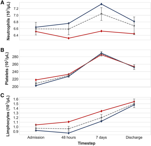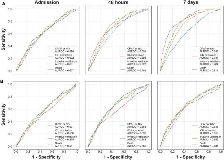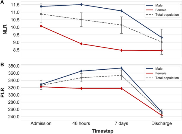 Results: We included 2169 patients. NLR and PLR were higher in severe coronavirus disease 2019 (COVID-19). Both ratios were able to distinguish the outcomes at each timepoint. For NLR, the areas under the receiver operating characteristic curve (AUROC) ranged between 0.59 and 0.81, and for PLR between 0.53 and 0.67. From each ROC curve we computed an optimal cutoff value.