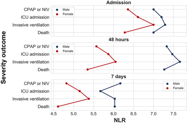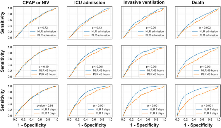 Introduction: The hyperinflammation phase of severe SARS-CoV-2 is characterised by complete blood count alterations. In this context, the neutrophil-to-lymphocyte ratio (NLR) and the platelet-to-lymphocyte ratio (PLR) can be used as prognostic factors. We studied NLR and PLR trends at different timepoints and computed optimal cutoffs to predict four outcomes: use of continuous positive airways pressure (CPAP), intensive care unit (ICU) admission, invasive ventilation and death.