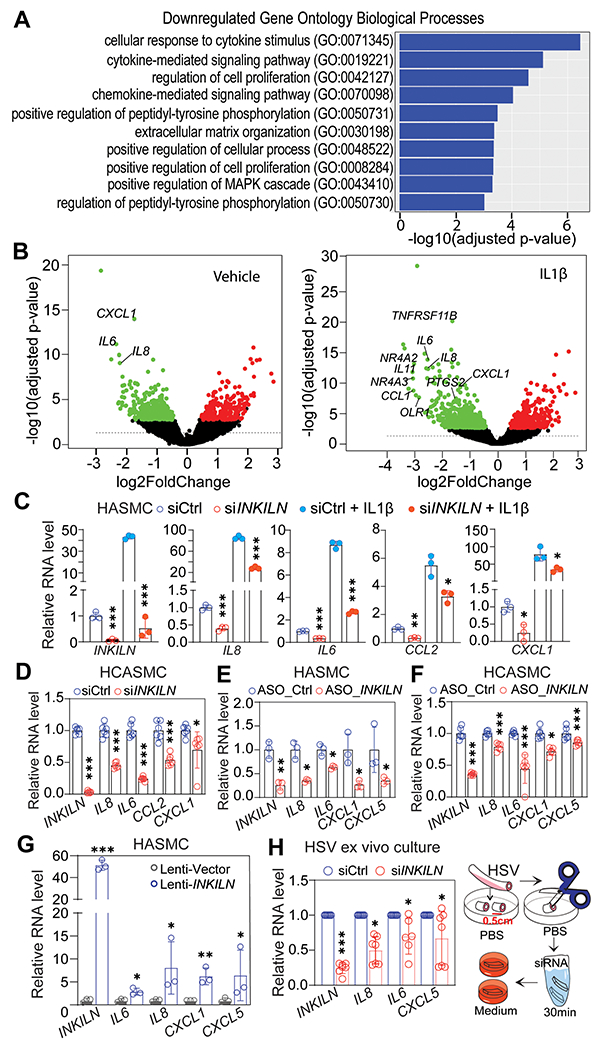 Methods: Bulk RNA sequencing in differentiated human VSMCs revealed a novel human-specific long noncoding RNA called inflammatory MKL1 (megakaryoblastic leukemia 1) interacting long noncoding RNA (INKILN). INKILN expression was assessed in multiple in vitro and ex vivo models of VSMC phenotypic modulation as well as human atherosclerosis and abdominal aortic aneurysm. The transcriptional regulation of INKILN was verified through luciferase reporter and chromatin immunoprecipitation assays. Loss-of-function and gain-of-function studies and multiple RNA-protein and protein-protein interaction assays were used to uncover a mechanistic role of INKILN in the VSMC proinflammatory gene program. Bacterial artificial chromosome transgenic mice were used to study INKILN expression and function in ligation injury-induced neointimal formation.