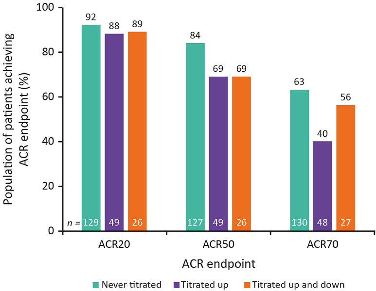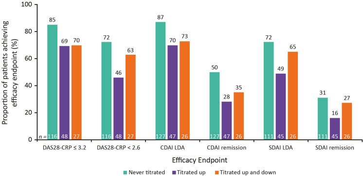 Methods: Patients from two phase 2b trials (BALANCE-1 and -2) enrolled in BALANCE-EXTEND (NCT02049138) and received open-label UPA 6 mg twice daily (BID). Dose increases to 12 mg BID were required for patients with < 20% improvement in swollen or tender joint counts at weeks 6 or 12 and permitted for those not achieving Clinical Disease Activity Index (CDAI) low disease activity (LDA; CDAI 2.8 to ≤ 10). Dose reduction to UPA 6 mg BID was permitted only for safety or tolerability reasons. After January 2017, the 6/12 mg BID doses were replaced by 15/30 mg once-daily extended-release equivalents. Efficacy and safety were monitored up to 6 years of UPA treatment; outcomes included rates of achievement of LDA or remission. Data were analyzed for patients who received the lower UPA dose throughout; titrated up to the higher UPA dose from weeks 6 or 12; or titrated to the higher UPA dose and back down.