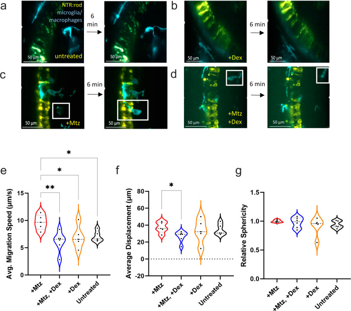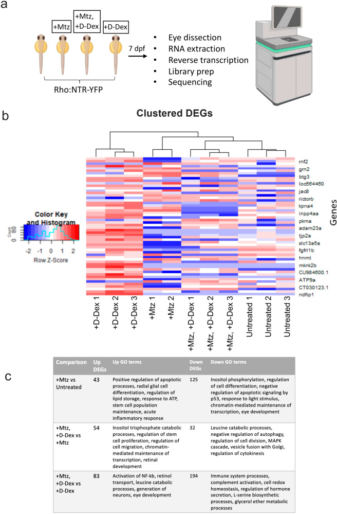 J.S.M. holds patents for the NTR inducible cell ablation system (US #7,514,595) and uses thereof (US #8,071,838 and US#8431768). R.M.K. and S.P.K. have been awarded pending patents relating to the hydroxyl dendrimer platform for ocular therapies. RMK and his wife (Sujatha Kannan) are co-founders/board members and have financial interests in Ashvattha Therapeutics Inc., a start-up focusing on clinical translation of the dendrimer platform. The remaining authors declare no competing interests.