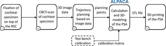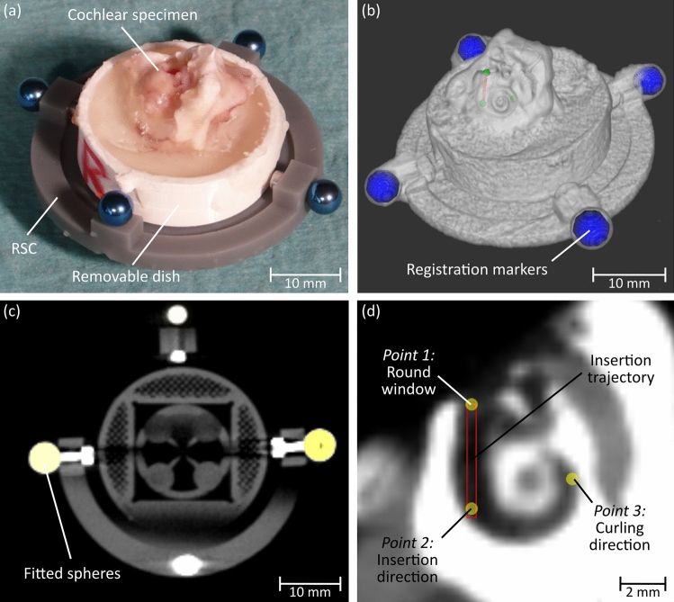 Conclusion: In this work, we present a new method, which enables automated calculation and creation of a ready-to-print pose setting adapter for alignment of cochlear specimens in insertion test setups. The approach is characterized by a high level of accuracy and reproducibility in controlling the insertion trajectory. Therefore, it enables a higher degree of standardization in force measurement when performing ex vivo insertion tests and thereby improves reliability in electrode testing.
