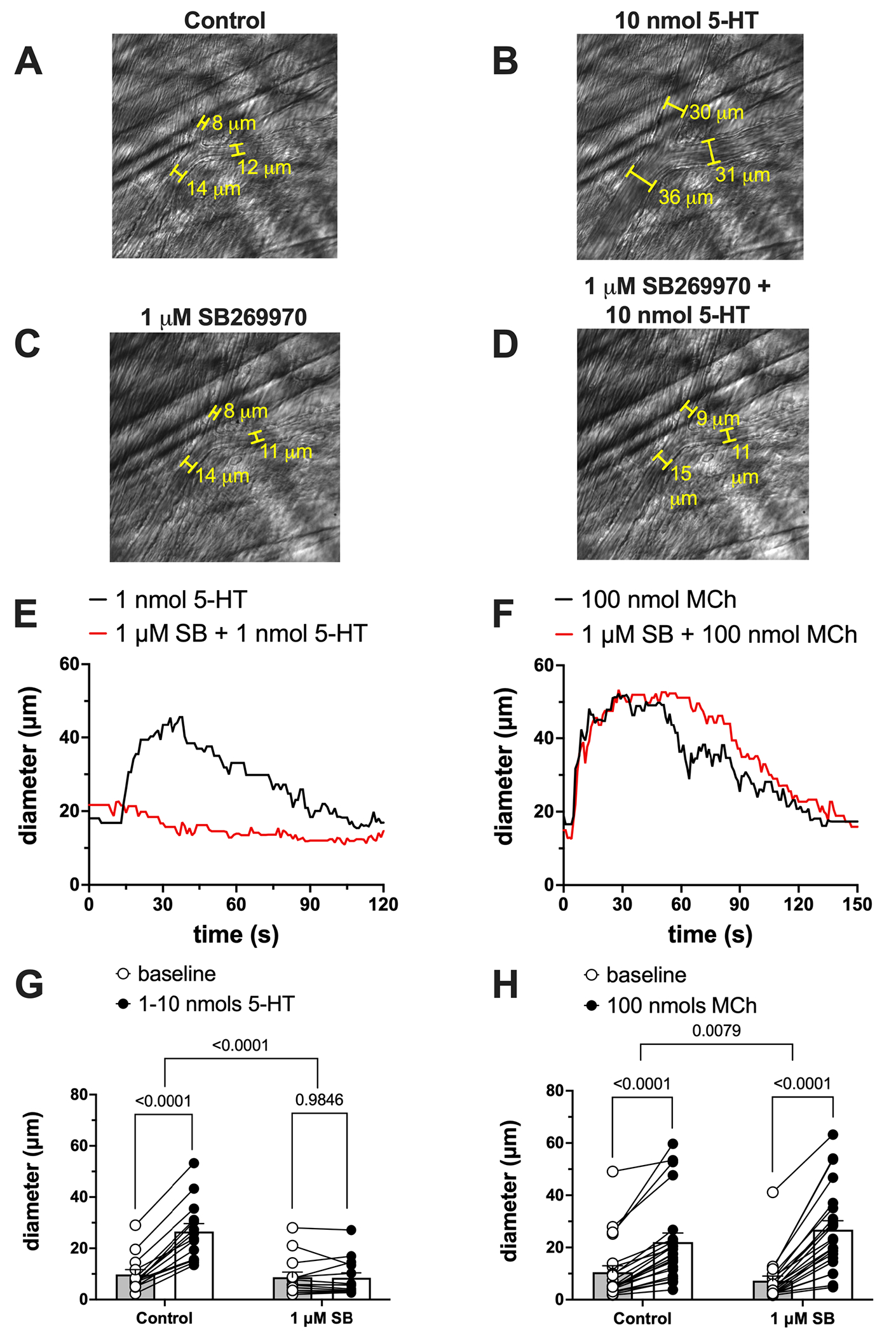 Results: Topical 5-HT (1-10 nmols) or the 5-HT1/7 receptor agonist, 5-carboxamidotryptamine (10-30 nM), dilated third- and fourth-order arterioles, responses that were abolished by 1 μM SB269970, a selective 5-HT7 receptor antagonist. In contrast, dilation induced by the muscarinic agonist, methacholine (100 nmols) was not inhibited by SB269970. Serotonin (10 nmols) failed to dilate cremaster arterioles in 5-HT7 receptor knockout rats whereas arterioles in wild-type litter mates dilated to 1 nmol 5-HT, a response blocked by 1 μM SB269970. Quantitative RT-PCR revealed that cremaster arterioles expressed mRNA for 5-HT7 receptors.