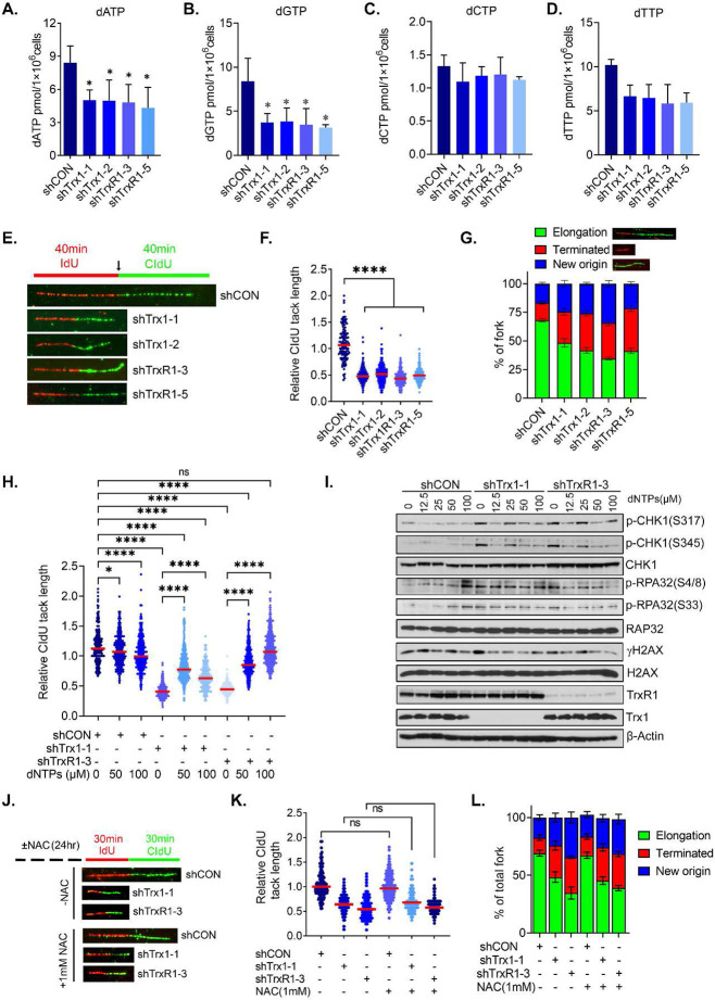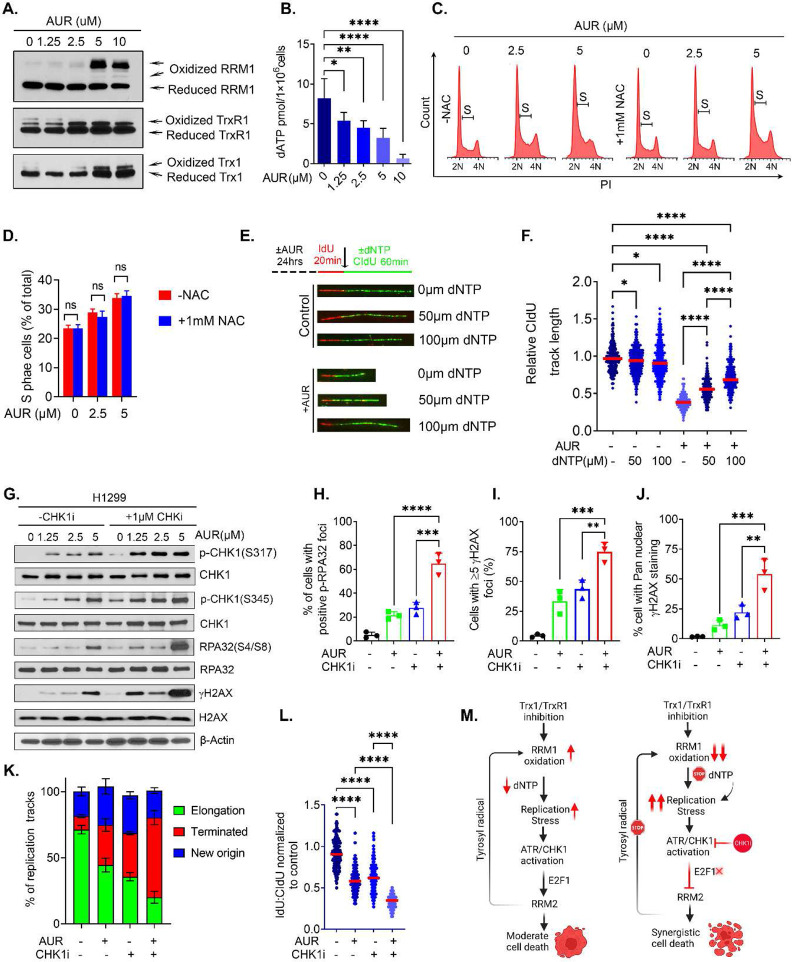 Checkpoint kinase 1 (CHK1) is critical for cell survival under replication stress (RS). CHK1 inhibitors (CHK1i's) in combination with chemotherapy have shown promising results in preclinical studies but minimal efficacy with substantial toxicity in clinical trials. To explore novel combinational strategies that can overcome these limitations, we performed an unbiased high-throughput screen in a non-small cell lung cancer (NSCLC) cell line and identified thioredoxin1 (Trx1), a major component of the mammalian antioxidant-system, as a novel determinant of CHK1i sensitivity. We established a role for redox recycling of RRM1, the larger subunit of ribonucleotide reductase (RNR), and a depletion of the deoxynucleotide pool in this Trx1-mediated CHK1i sensitivity. Further, the TrxR1 inhibitor auronafin, an anti-rheumatoid arthritis drug, shows a synergistic interaction with CHK1i via interruption of the deoxynucleotide pool. Together, these findings identify a new pharmacological combination to treat NSCLC that relies on a redox regulatory link between the Trx system and mammalian RNR activity.