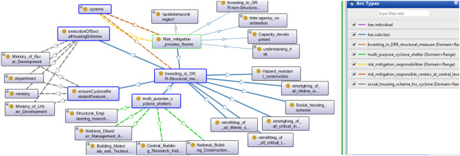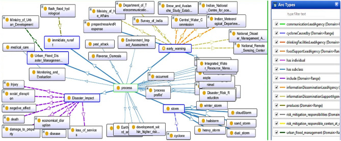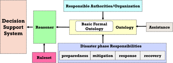The geographical location of any region, as well as large-scale environmental changes caused by a variety of factors, invite a wide range of disasters. Floods, droughts, earthquakes, cyclones, landslides, tornadoes, and cloudbursts are all common natural disasters that destroy property and kill people. On average, 0.1% of the total deaths globally in the past decade have been due to natural disasters. The National Disaster Management Authority (NDMA), a branch of the Ministry of Home Affairs, plays an important role in disaster management in India by taking responsibility for risk mitigation, response, and recovery from all natural and man-made disasters. This article presents an ontology-based disaster management framework based on the NDMA's responsibility matrix. This ontological base framework is named as Disaster Management Ontology (DMO). It aids in task distribution among necessary authorities at various stages of a disaster, as well as a knowledge-driven decision support system for financial assistance to victims. In the proposed DMO, ontology has been used to integrate knowledge as well as a working platform for reasoners, and the Decision Support System (DSS) ruleset is written in Semantic Web Rule Language (SWRL), which is based on the First Order Logic (FOL) concept. In addition, OntoGraph, a class view of taxonomy, is used to make taxonomy more interactive for users.