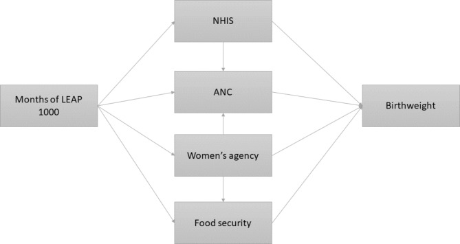 Results: Our study included a sample of 1,439 infants with complete information on birthweight and date of birth. Nine percent of infants (N = 129) were exposed to LEAP 1000 before delivery. A 1-month increase in exposure to LEAP 1000 before delivery was associated with a 9-gram increase in birthweight and 7% reduced odds of low birthweight, on average, in adjusted models. We found no mediation effect by household food insecurity, NHIS enrollment, women's agency, or antenatal care visits.