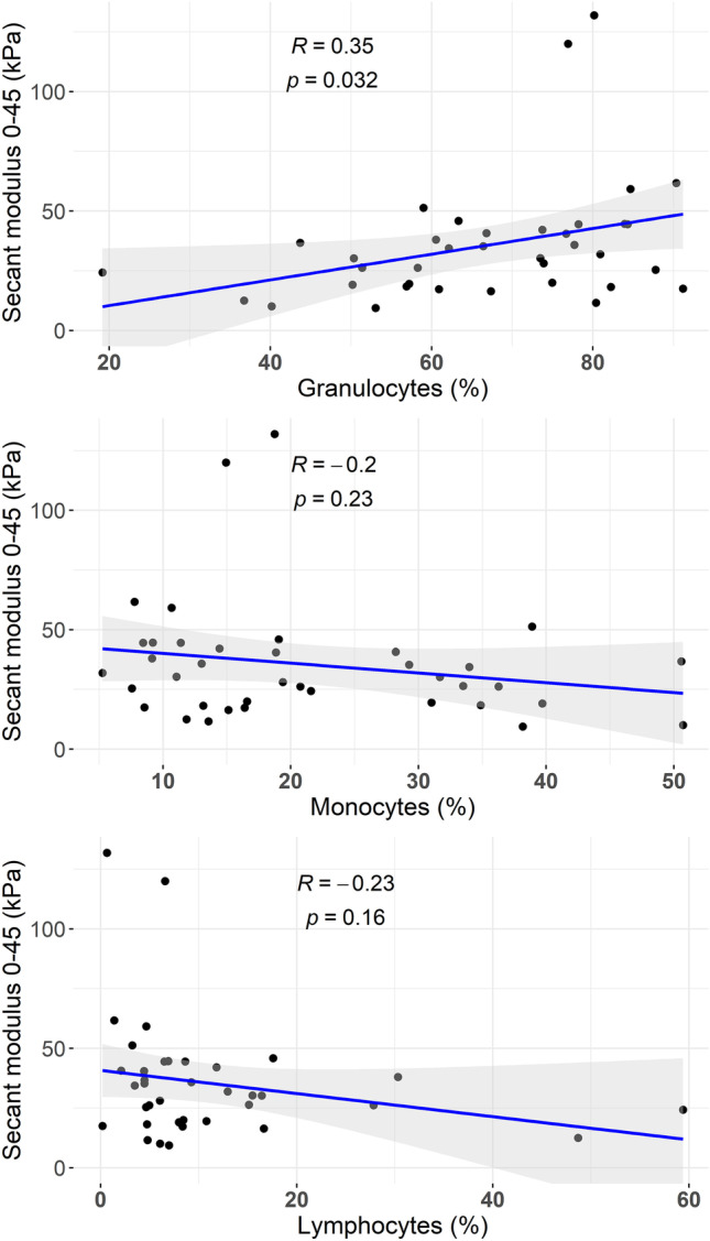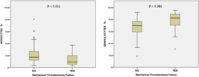 We aim to identify a profile of intracranial thrombus resistant to recanalization by mechanical thrombectomy (MT) in acute stroke treatment. The first extracted clot of each MT was analyzed by flow cytometry obtaining the composition of the main leukocyte populations: granulocytes, monocytes, and lymphocytes. Demographics, reperfusion treatment, and grade of recanalization were registered. MT failure (MTF) was defined as final thrombolysis in cerebral infarction score IIa or lower and/or need of permanent intracranial stenting as a rescue therapy. To explore the relationship between stiffness of intracranial clots and cellular composition, unconfined compression tests were performed in other cohorts of cases. Thrombi obtained in 225 patients were analyzed. MTF were observed in 30 cases (13%). MTF was associated with atherosclerosis etiology (33.3% vs. 15.9%; p = 0.021) and higher number of passes (3 vs. 2; p < 0.001). Clot analysis of MTF showed higher percentage of granulocytes [82.46 vs. 68.90% p < 0.001] and lower percentage of monocytes [9.18% vs.17.34%, p < 0.001] in comparison to successful MT cases. The proportion of clot granulocytes (aOR 1.07; 95% CI 1.01-1.14) remained an independent marker of MTF. Among thirty-eight clots mechanically tested, there was a positive correlation between granulocyte proportion and thrombi stiffness (Pearson's r = 0.35, p = 0.032), with a median clot stiffness of 30.2 (IQR, 18.9-42.7) kPa. Granulocytes-rich thrombi are harder to capture by mechanical thrombectomy due to increased stiffness, so a proportion of intracranial granulocytes might be useful to guide personalized endovascular procedures in acute stroke treatment.
