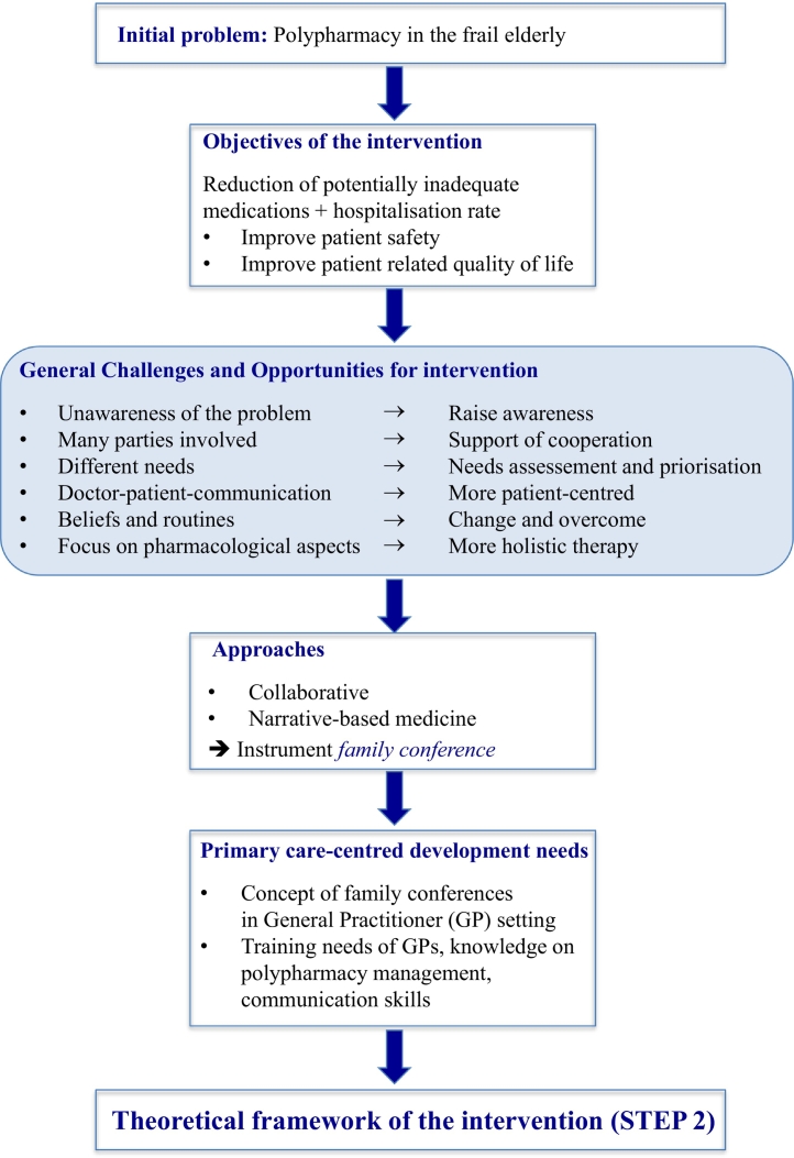 Methods: Mixed methods study including: 1) scoping review on family conferences, expert panels; 2) group discussions with GPs, mapping of needs and challenges in Primary Care; 3) workshops and expert interviews with GPs, patient advocates, researchers as a basis for a theoretical intervention model; 4) piloting.