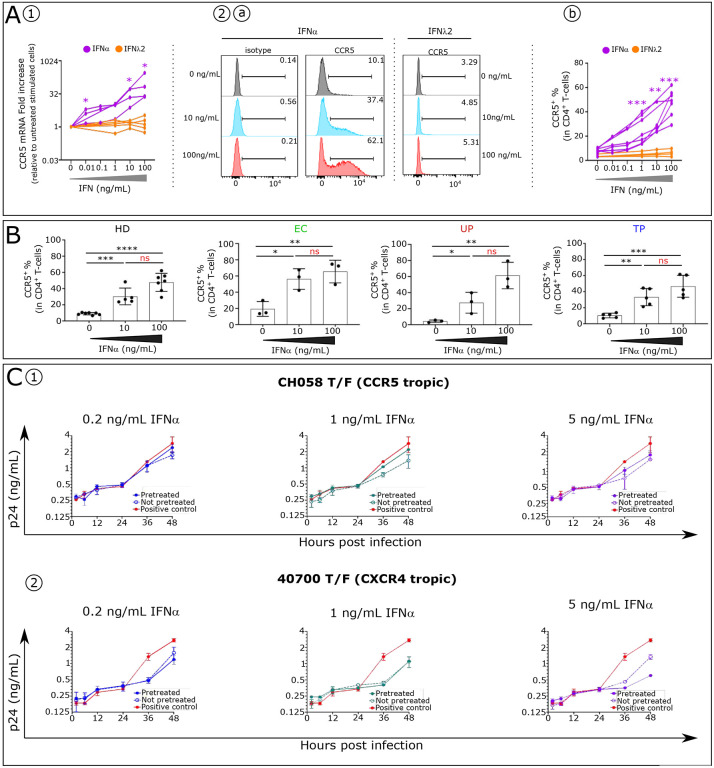IFNα induces CCR5 in CD4+ T-cells, causing its anti- HIV inefficiency and its subsequent pathogenic elevation, partially controlled by anti-HIV therapy