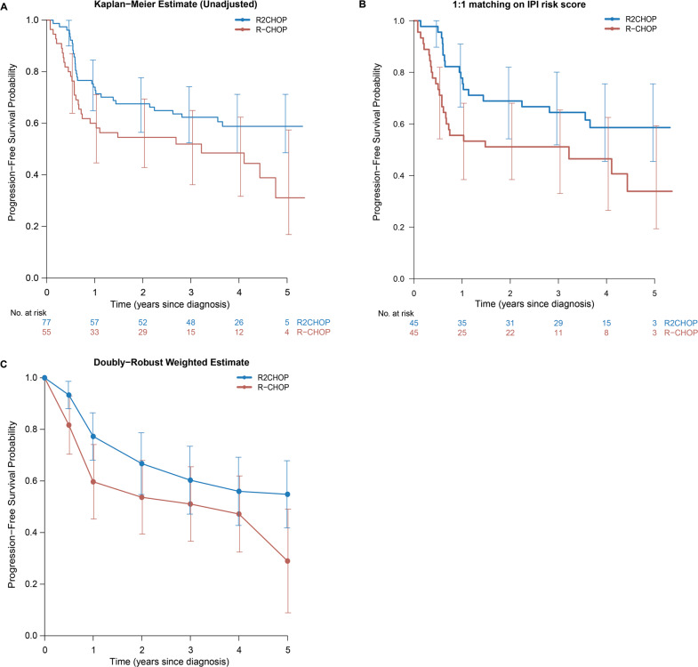 Patients with MYC rearranged (MYC-R) diffuse large B-cell lymphoma (DLBCL) have a poor prognosis. Previously, we demonstrated in a single-arm phase II trial (HOVON-130) that addition of lenalidomide to R-CHOP (R2CHOP) is well-tolerated and yields similar complete metabolic remission rates as more intensive chemotherapy regimens in literature. In parallel with this single-arm interventional trial, a prospective observational screening cohort (HOVON-900) was open in which we identified all newly diagnosed MYC-R DLBCL patients in the Netherlands. Eligible patients from the observational cohort that were not included in the interventional trial served as control group in the present risk-adjusted comparison. R2CHOP treated patients from the interventional trial (n = 77) were younger than patients in the R-CHOP control cohort (n = 56) (median age 63 versus 70 years, p = 0.018) and they were more likely to have a lower WHO performance score (p = 0.013). We adjusted for differences at baseline using 1:1 matching, multivariable analysis, and weighting using the propensity score to reduce treatment-selection bias. These analyses consistently showed improved outcome after R2CHOP with HRs of 0.53, 0.51, and 0.59, respectively, for OS, and 0.53, 0.59, and 0.60 for PFS. Thus, this non-randomized risk-adjusted comparison supports R2CHOP as an additional treatment option for MYC-R DLBCL patients.