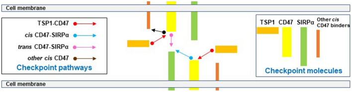 The use of treatments, such as programmed death protein 1 (PD1) or cytotoxic T lymphocyte-associated antigen 4 (CTLA-4) antibodies, that loosen the natural checks upon immune cell activity to enhance cancer killing have shifted clinical practice and outcomes for the better. Accordingly, the number of antibodies and engineered proteins that interact with the ligand-receptor components of immune checkpoints continue to increase along with their use. It is tempting to view these molecular pathways simply from an immune inhibitory perspective. But this should be resisted. Checkpoint molecules can have other cardinal functions relevant to the development and use of blocking moieties. Cell receptor CD47 is an example of this. CD47 is found on the surface of all human cells. Within the checkpoint paradigm, non-immune cell CD47 signals through immune cell surface signal regulatory protein alpha (SIRPα) to limit the activity of the latter, the so-called trans signal. Even so, CD47 interacts with other cell surface and soluble molecules to regulate biogas and redox signaling, mitochondria and metabolism, self-renewal factors and multipotency, and blood flow. Further, the pedigree of checkpoint CD47 is more intricate than supposed. High-affinity interaction with soluble thrombospondin-1 (TSP1) and low-affinity interaction with same-cell SIRPα, the so-called cis signal, and non-SIRPα ectodomains on the cell membrane suggests that multiple immune checkpoints converge at and through CD47. Appreciation of this may provide latitude for pathway-specific targeting and intelligent therapeutic effect.