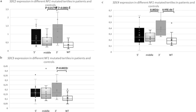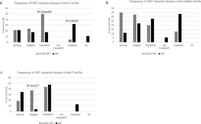 Spinal neurofibromatosis (SNF) is a form of neurofibromatosis type 1 (NF1) characterized by bilateral neurofibromas involving all spinal roots. The pathogenic mechanisms determining the SNF form are currently unknown. To verify the presence of genetic variants possibly related to SNF or classic NF1, we studied 106 sporadic NF1 and 75 SNF patients using an NGS panel of 286 genes encoding RAS pathway effectors and neurofibromin interactors and evaluated the expression of syndecans (SDC1, SDC2, SDC3, SDC4), the NF1 3' tertile interactors, by quantitative real-time PCR. We previously identified 75 and 106 NF1 variants in SNF and NF1 cohorts, respectively. The analysis of the distribution of pathogenic NF1 variants in the three NF1 tertiles showed a significantly higher prevalence of NF1 3' tertile mutations in SNF than in the NF1 cohort. We hypothesized a potential pathogenic significance of the 3' tertile NF1 variants in SNF. The analysis of syndecan expression on PBMCs RNAs from 16 SNF, 16 classic NF1 patients and 16 healthy controls showed that the expression levels of SDC2 and SDC3 were higher in SNF and NF1 patients than in controls; moreover, SDC2, SDC3 and SDC4 were significantly over expressed in patients mutated in the 3' tertile compared to controls. Two different mutational NF1 spectra seem to characterize SNF and classic NF1, suggesting a pathogenic role of NF1 3' tertile and its interactors, syndecans, in SNF. Our study, providing new insights on a possible role of neurofibromin C-terminal in SNF, could address effective personalized patient management and treatments.