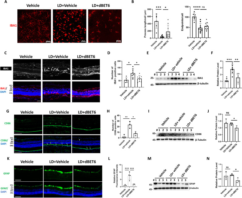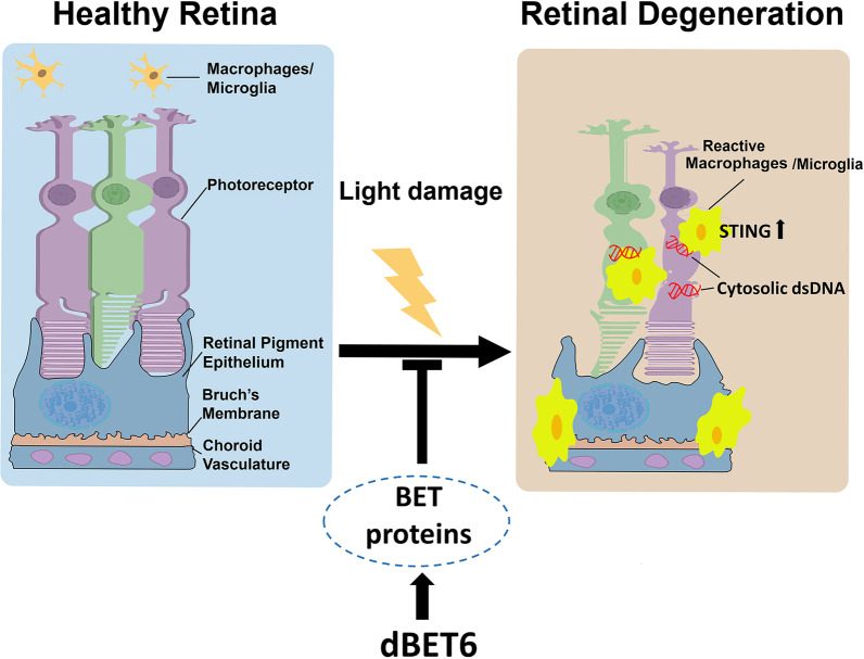 Results: Intraperitoneal injection of dBET6 led to the rapid degradation of BET protein in the retina without detectable toxicity. dBET6 improved retinal responsiveness and visual acuity after light damage (LD). dBET6 also repressed LD-induced retinal macrophages/microglia activation, Müller cell gliosis, photoreceptor death and retinal degeneration. Analysis of single-cell RNA-sequencing results revealed cGAS-STING components were expressed in retinal microglia. LD led to dramatic activation of the cGAS-STING pathway, whereas dBET6 suppressed LD-induced STING expression in reactive macrophages/microglia and the related inflammatory response.