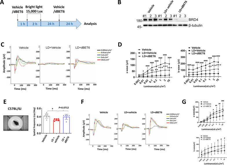 Methods: Mice were exposed to bright light to induce retinal degeneration, and the activation of cGAS-STING was determined by RNA-sequencing and molecular biology. Retinal function, morphology, photoreceptor viability and retinal inflammation were examined in the presence and absence of dBET6 treatment.