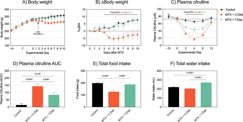 Cytotoxicity (i.e. cell death) is the core mechanism by which chemotherapy induces its anti-cancer effects. Unfortunately, this same mechanism underpins the collateral damage it causes to healthy tissues. The gastrointestinal tract is highly susceptible to chemotherapy's cytotoxicity, resulting in ulcerative lesions (termed gastrointestinal mucositis, GI-M) that impair the functional capacity of the gut leading to diarrhea, anorexia, malnutrition and weight loss, which negatively impact physical/psychological wellbeing and treatment adherence. Preventing these side effects has proven challenging given the overlapping mechanisms that dictate chemotherapy efficacy and toxicity. Here, we report on a novel dietary intervention that, due to its localized gastrointestinal effects, is able to protect the intestinal mucosal from unwanted toxicity without impairing the anti-tumor effects of chemotherapy. The test diet (containing extensively hydrolyzed whey protein and medium chain triglycerides (MCTs)), was investigated in both tumor-naïve and tumor-bearing models to evaluate its effect on GI-M and chemo-efficacy, respectively. In both models, methotrexate was used as the representative chemotherapeutic agent and the diet was provided ad libitum for 14 days prior to treatment. GI-M was measured using the validated biomarker plasma citrulline, and chemo-efficacy defined by tumor burden (cm3/g body weight). The test diet significantly attenuated GI-M (P = 0.03), with associated reductions in diarrhea (P < 0.0001), weight loss (P < 0.05), daily activity (P < 0.02) and maintenance of body composition (P < 0.02). Moreover, the test diet showed significant impact on gut microbiota by increasing diversity and resilience, whilst also altering microbial composition and function (indicated by cecal short and brained chain fatty acids). The test diet did not impair the efficacy of methotrexate against mammary adenocarcinoma (tumor) cells. In line with the first model, the test diet minimized intestinal injury (P = 0.001) and diarrhea (P < 0.0001). These data support translational initiatives to determine the clinical feasibility, utility and efficacy of this diet to improve chemotherapy treatment outcomes.