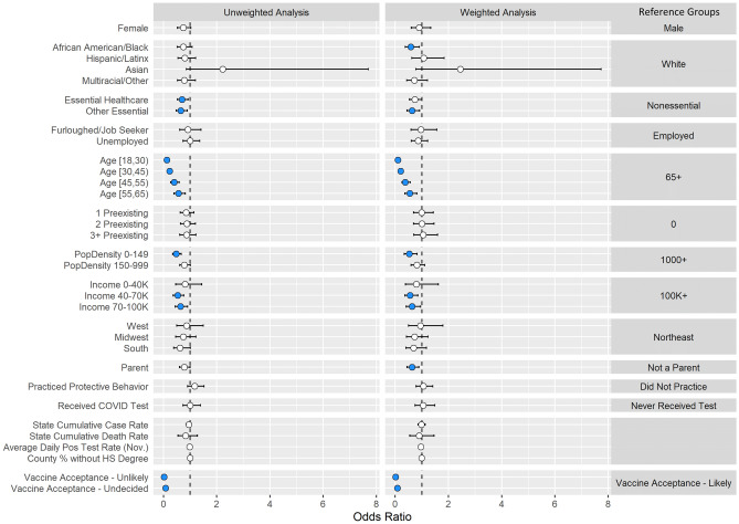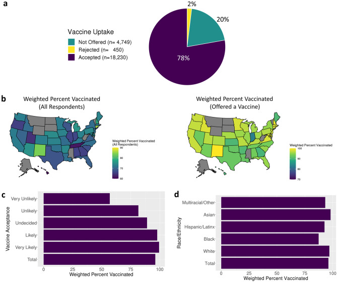 SARS-CoV-2 vaccines are useful tools to combat the Coronavirus Disease 2019 (COVID-19) pandemic, but vaccine reluctance threatens these vaccines' effectiveness. To address COVID-19 vaccine reluctance and ensure equitable distribution, understanding the extent of and factors associated with vaccine acceptance and uptake is critical. We report the results of a large nationwide study in the US conducted December 2020-May 2021 of 36,711 users from COVID-19-focused smartphone-based app How We Feel on their willingness to receive a COVID-19 vaccine. We identified sociodemographic and behavioral factors that were associated with COVID-19 vaccine acceptance and uptake, and we found several vulnerable groups at increased risk of COVID-19 burden, morbidity, and mortality were more likely to be reluctant to accept a vaccine and had lower rates of vaccination. Our findings highlight specific populations in which targeted efforts to develop education and outreach programs are needed to overcome poor vaccine acceptance and improve equitable access, diversity, and inclusion in the national response to COVID-19.