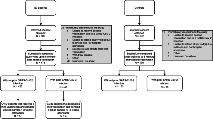 Methods: In a prospective multicenter study, 473 IEI patients (including X-linked agammaglobulinemia (XLA) (N = 18), combined immunodeficiency (CID) (N = 22), CVID (N = 203), isolated or undefined antibody deficiencies (N = 204), and phagocyte defects (N = 16)), and 179 controls were included and followed up to 6 months after two doses of the mRNA-1273 COVID-19 vaccine. Additionally, samples were collected from 50 CVID patients who received a third vaccine 6 months after primary vaccination through the national vaccination program. SARS-CoV-2-specific IgG titers, neutralizing antibodies, and T cell responses were assessed.