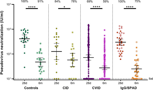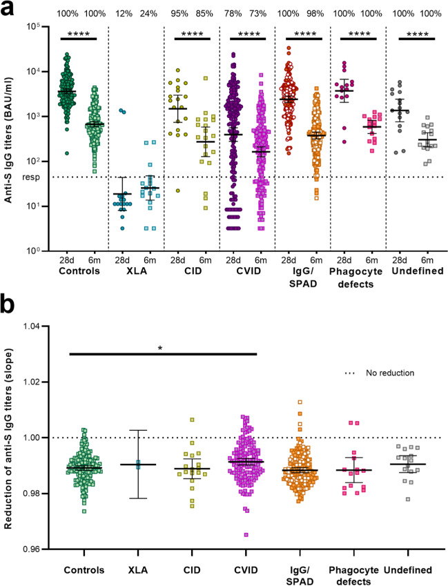 Results: At 6 months after vaccination, the geometric mean antibody titers (GMT) declined in both IEI patients and healthy controls, when compared to GMT 28 days after vaccination. The trajectory of this decline did not differ between controls and most IEI cohorts; however, antibody titers in CID, CVID, and isolated antibody deficiency patients more often dropped to below the responder cut-off compared to controls. Specific T cell responses were still detectable in 77% of controls and 68% of IEI patients at 6 months post vaccination. A third mRNA vaccine resulted in an antibody response in only two out of 30 CVID patients that did not seroconvert after two mRNA vaccines.