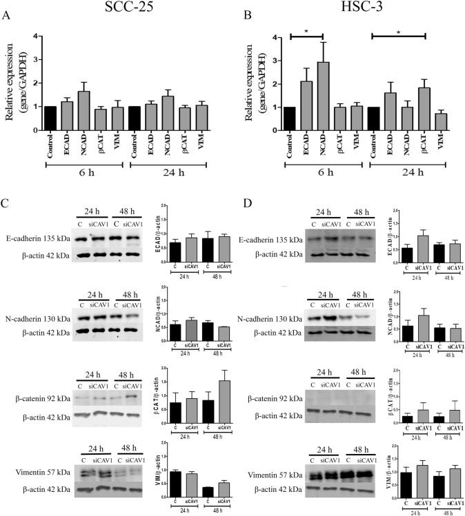 Results: Microarray showed a greater CAV-1 expression (1.77-fold) in OSCC tumors than in non-tumoral tissues and 2.0-fold more in less aggressive OSCCs. However, significant differences in CAV-1 gene expression were not seen between tumors and non-tumoral margins nor CAV-1 with any clinicopathological parameters. CAV-1 protein was localized both in carcinoma and in spindle cells of the tumor microenvironment (TME), and CAV-1 positive TME cells were associated with smaller/more aggressive tumors, independent of the carcinoma cells' expression. Silencing of CAV-1 increased cell viability only in SCC-25 cells. It also stimulated the invasion of HSC-3 cells and increased ECAD and BCAT mRNA in these cells; however, the protein levels of the EMT markers were not affected.