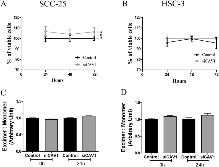Background: Changes in Caveolin-1 (CAV-1) expression are related to tumorigenesis. The aim of this study was to evaluate the role of CAV-1 in tumor progression in oral squamous cell carcinoma (SCC) tissue samples and the effect of CAV-1 silencing on two oral tongue SCC (OTSCC) cell lines (SCC-25, from a primary tumor, and HSC-3 from lymph node metastases).