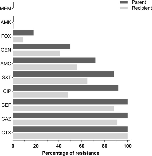 CTX-Ms are encoded by blaCTX-M genes and are widely distributed extended-spectrum β-lactamases (ESBLs). They are the most important antimicrobial resistance (AMR) mechanism to β-lactam antibiotics in the Enterobacteriaceae. However, the role of transmissible AMR plasmids in the dissemination of blaCTX-M genes has scarcely been studied in Africa where the burden of AMR is high and rapidly spreading. In this study, AMR plasmid transmissibility, replicon types and addiction systems were analysed in CTX-M-producing Escherichia coli clinical isolates in Ethiopia with a goal to provide molecular insight into mechanisms underlying such high prevalence and rapid dissemination. Of 100 CTX-Ms-producing isolates obtained from urine (84), pus (10) and blood (6) from four geographically distinct healthcare settings, 75% carried transmissible plasmids encoding for CTX-Ms, with CTX-M-15 being predominant (n = 51). Single IncF plasmids with the combination of F-FIA-FIB (n = 17) carried the bulk of blaCTX-M-15 genes. In addition, IncF plasmids were associated with multiple addiction systems, ISEcp1 and various resistance phenotypes for non-cephalosporin antibiotics. Moreover, IncF plasmid carriage is associated with the international pandemic E. coli ST131 lineage. Furthermore, several CTX-M encoding plasmids were associated with serum survival of the strains, but less so with biofilm formation. Hence, both horizontal gene transfer and clonal expansion may contribute to the rapid and widespread distribution of blaCTX-M genes among E. coli populations in Ethiopian clinical settings. This information is relevant for local epidemiology and surveillance, but also for global understanding of the successful dissemination of AMR gene carrying plasmids.