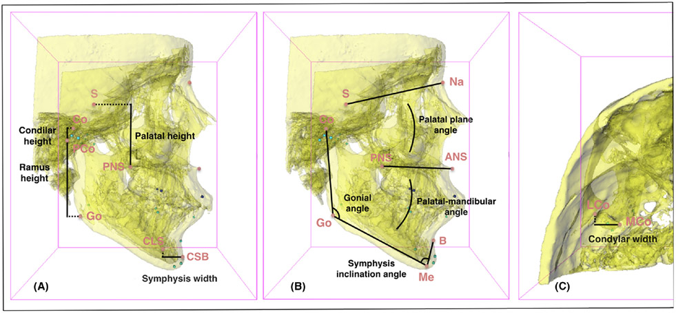 Results: Significant differences were found between the groups regarding condylar width, ramus height, condylar plus ramus height, mandibular length, gonial angle, palatal plane angle and palatal-mandibular angle. No differences (P > .05) were found for the condylar height, symphysis inclination angle or palatal height. Correlations (P < .05) were found between the MP angle and structures of the maxillomandibular complex.