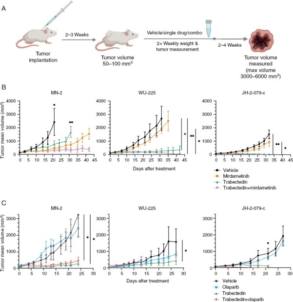 Methods: Genomic analysis was performed on all PDX-tumor pairs. Selected PDX were harvested for assembly into 3D microtissues. Based on prior work in our labs, we evaluated drugs (trabectedin, olaparib, and mirdametinib) ex vivo and in vivo. For 3D microtissue studies, cell viability was the endpoint as assessed by Zeiss Axio Observer. For PDX drug studies, tumor volume was measured twice weekly. Bulk RNA sequencing was performed to identify pathways enriched in cells.