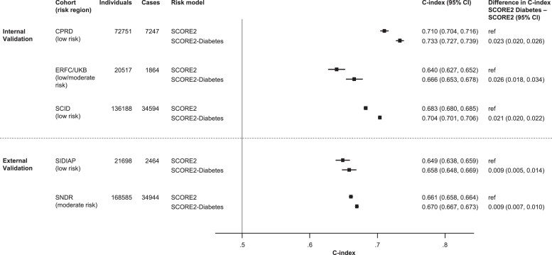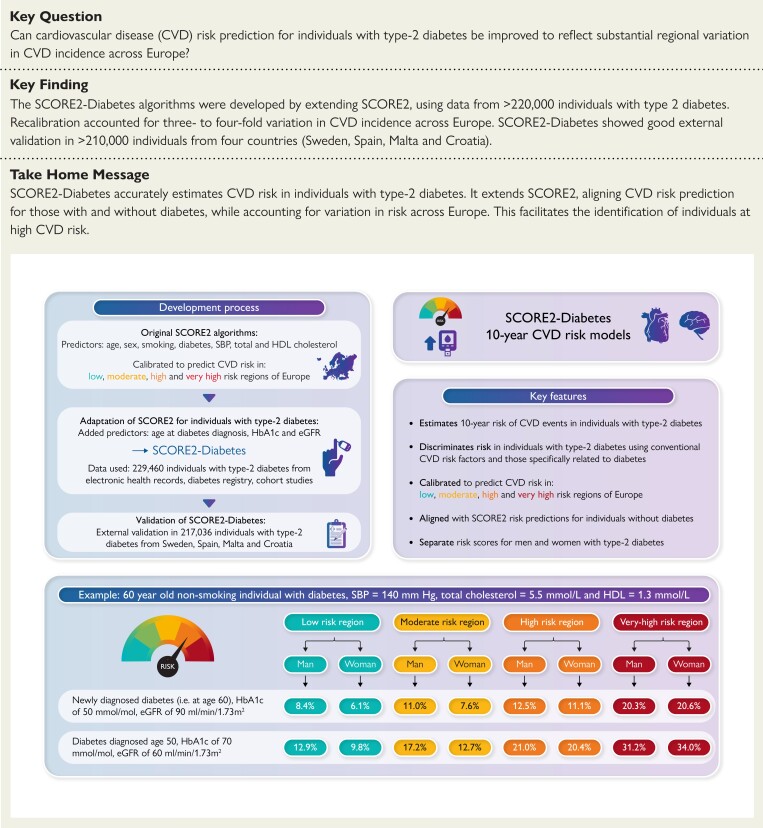 Conclusion: SCORE2-Diabetes, a new algorithm developed, calibrated, and validated to predict 10-year risk of CVD in individuals with type 2 diabetes, enhances identification of individuals at higher risk of developing CVD across Europe.