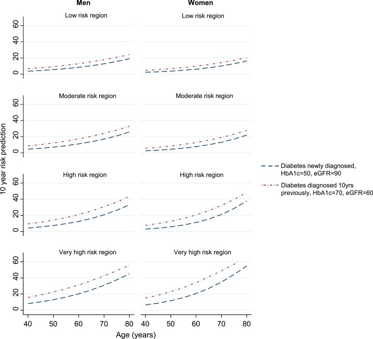 Methods and results: SCORE2-Diabetes was developed by extending SCORE2 algorithms using individual-participant data from four large-scale datasets comprising 229 460 participants (43 706 CVD events) with type 2 diabetes and without previous CVD. Sex-specific competing risk-adjusted models were used including conventional risk factors (i.e. age, smoking, systolic blood pressure, total, and HDL-cholesterol), as well as diabetes-related variables (i.e. age at diabetes diagnosis, glycated haemoglobin [HbA1c] and creatinine-based estimated glomerular filtration rate [eGFR]). Models were recalibrated to CVD incidence in four European risk regions. External validation included 217 036 further individuals (38 602 CVD events), and showed good discrimination, and improvement over SCORE2 (C-index change from 0.009 to 0.031). Regional calibration was satisfactory. SCORE2-Diabetes risk predictions varied several-fold, depending on individuals' levels of diabetes-related factors. For example, in the moderate-risk region, the estimated 10-year CVD risk was 11% for a 60-year-old man, non-smoker, with type 2 diabetes, average conventional risk factors, HbA1c of 50 mmol/mol, eGFR of 90 mL/min/1.73 m2, and age at diabetes diagnosis of 60 years. By contrast, the estimated risk was 17% in a similar man, with HbA1c of 70 mmol/mol, eGFR of 60 mL/min/1.73 m2, and age at diabetes diagnosis of 50 years. For a woman with the same characteristics, the risk was 8% and 13%, respectively.