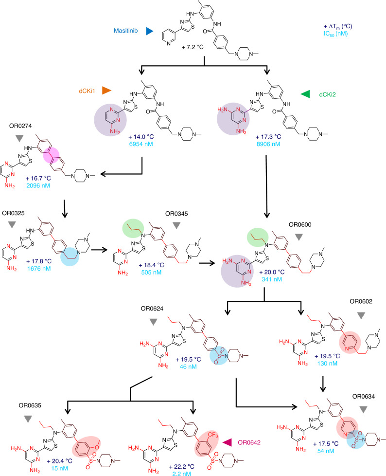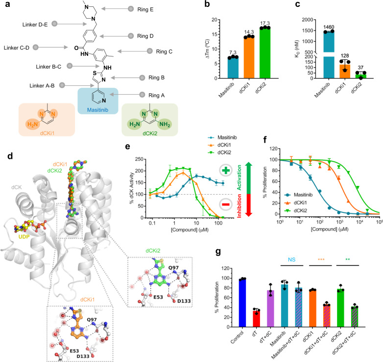 Cancer cells utilize the main de novo pathway and the alternative salvage pathway for deoxyribonucleotide biosynthesis to achieve adequate nucleotide pools. Deoxycytidine kinase is the rate-limiting enzyme of the salvage pathway and it has recently emerged as a target for anti-proliferative therapies for cancers where it is essential. Here, we present the development of a potent inhibitor applying an iterative multidisciplinary approach, which relies on computational design coupled with experimental evaluations. This strategy allows an acceleration of the hit-to-lead process by gradually implementing key chemical modifications to increase affinity and activity. Our lead compound, OR0642, is more than 1000 times more potent than its initial parent compound, masitinib, previously identified from a drug repositioning approach. OR0642 in combination with a physiological inhibitor of the de novo pathway doubled the survival rate in a human T-cell acute lymphoblastic leukemia patient-derived xenograft mouse model, demonstrating the proof-of-concept of this drug design strategy.