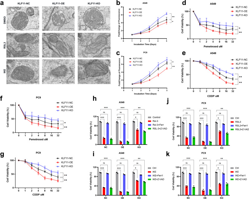 Ferroptosis, an iron-dependent non-apoptotic cell death, has been shown to play a vital role in tumor proliferation and chemotherapy resistance. Here, we report that KLF11 inhibits lung adenocarcinoma (LUAD) cell proliferation and promotes chemotherapy sensitivity by participating in the GPX4-related ferroptosis pathway. Through an RNA-sequence screen from LUAD cells pretreatment with ferroptosis inducers (FINs), we discovered that KLF11 expression was significantly higher in FINs-treated cells, suggesting that KLF11 may be involved in ferroptosis. Overexpression of KLF11 promoted LUAD cells to undergo ferroptosis alterations. Meanwhile, upregulation of KLF11 expression also inhibited cell proliferation and increased chemosensitivity, whereas knockout of KLF11 did the opposite. With ChIP-Seq and RNA-Seq, we identified GPX4 as a downstream target of KLF11. Through ChIP-qPCR and dual luciferase assay, we clarified that KLF11 binds to the promoter region of GPX4 and represses its transcription. Restored GPX4 expression antagonized the ability of KLF11 to promote ferroptosis, increase chemotherapy sensitivity and inhibit cell proliferation in vitro and in vivo. Clinically, KLF11 declined in LUAD and its low expression was associated with reduced patient survival. Our findings established the function of KLF11 to promote ferroptosis in LUAD, thereby inhibiting cell proliferation and enhancing the efficacy of chemotherapy.