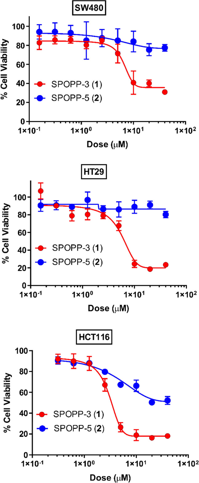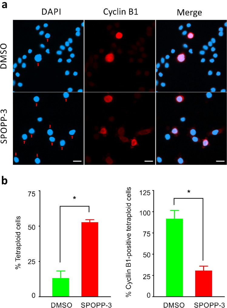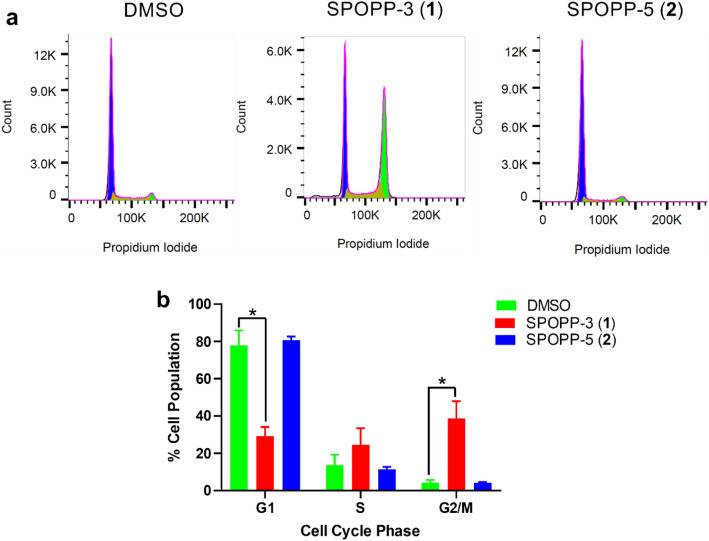 Dispiropiperazine compounds are a class of molecules known to confer biological activity, but those that have been studied as cell cycle regulators are few in number. Here, we report the characterization and synthesis of two dispiropiperazine derivatives: the previously synthesized spiro[2',3]-bis(acenaphthene-1'-one)perhydrodipyrrolo-[1,2-a:1,2-d]-pyrazine (SPOPP-3, 1), and its previously undescribed isomer, spiro[2',5']-bis(acenaphthene-1'-one)perhydrodipyrrolo-[1,2-a:1,2-d]-pyrazine (SPOPP-5, 2). SPOPP-3 (1), but not SPOPP-5 (2), was shown to have anti-proliferative activity against a panel of 18 human cancer cell lines with IC50 values ranging from 0.63 to 13 µM. Flow cytometry analysis revealed that SPOPP-3 (1) was able to arrest cell cycle at the G2/M phase in SW480 human cancer cells. Western blot analysis further confirmed the cell cycle arrest is in the M phase. In addition, SPOPP-3 (1) was shown to induce apoptosis, necrosis, and DNA damage as well as disrupt mitotic spindle positioning in SW480 cells. These results warrant further investigation of SPOPP-3 (1) as a novel anti-cancer agent, particularly for its potential ability to sensitize cancer cells for radiation-induced cell death, enhance cancer immunotherapy, overcome apoptosis-related drug resistance and for possible use in synthetic lethality cancer treatments.