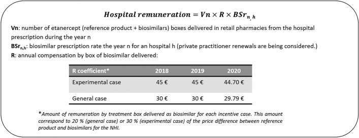 Background: Regarding the low penetration of biosimilars in the French market, in 2018, the government introduced two mutually exclusive financial incentives to increase biosimilar use. They redirect 20% (general case) or 30% (experimental case) of the price difference between the reference product and its biosimilar to hospitals for every biosimilar delivered in retail pharmacies from these hospital prescriptions. The experimental case specifically targets prescribing clinical units.