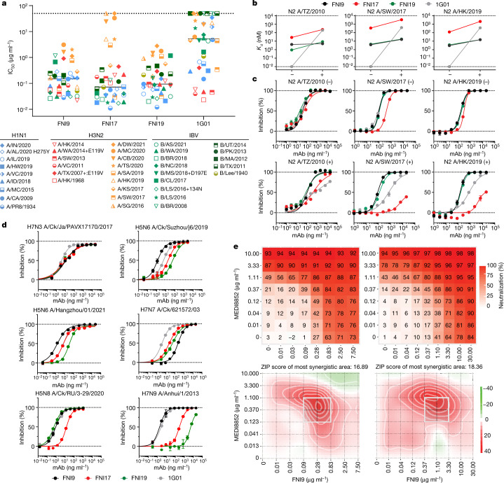 Rapidly evolving influenza A viruses (IAVs) and influenza B viruses (IBVs) are major causes of recurrent lower respiratory tract infections. Current influenza vaccines elicit antibodies predominantly to the highly variable head region of haemagglutinin and their effectiveness is limited by viral drift1 and suboptimal immune responses2. Here we describe a neuraminidase-targeting monoclonal antibody, FNI9, that potently inhibits the enzymatic activity of all group 1 and group 2 IAVs, as well as Victoria/2/87-like, Yamagata/16/88-like and ancestral IBVs. FNI9 broadly neutralizes seasonal IAVs and IBVs, including the immune-evading H3N2 strains bearing an N-glycan at position 245, and shows synergistic activity when combined with anti-haemagglutinin stem-directed antibodies. Structural analysis reveals that D107 in the FNI9 heavy chain complementarity-determinant region 3 mimics the interaction of the sialic acid carboxyl group with the three highly conserved arginine residues (R118, R292 and R371) of the neuraminidase catalytic site. FNI9 demonstrates potent prophylactic activity against lethal IAV and IBV infections in mice. The unprecedented breadth and potency of the FNI9 monoclonal antibody supports its development for the prevention of influenza illness by seasonal and pandemic viruses.