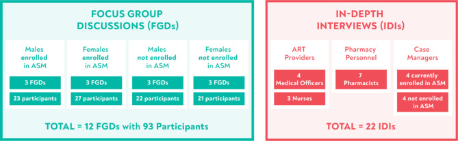 Methods: Using a parallel convergent mixed-methods study design, we conducted 6 focus groups with ASM-eligible enrolled clients, 6 with ASM-eligible non-enrolled clients, and 22 in-depth interviews with HCWs. Data were audio-recorded, transcribed and translated into English. We used thematic analysis, initially coding deductively, followed by inductive coding of themes that emerged from the data, and compared the perspectives of ASM-enrolled and non-enrolled clients and their HCWs.